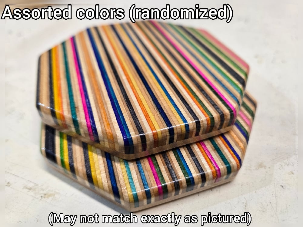 Coasters made from recycled skateboards. Each item is for a set of 2 Coasters.