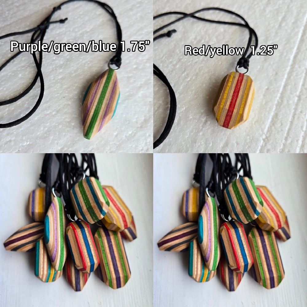 Necklaces made from recycled skateboards. Charms are shaped like a gemstone.