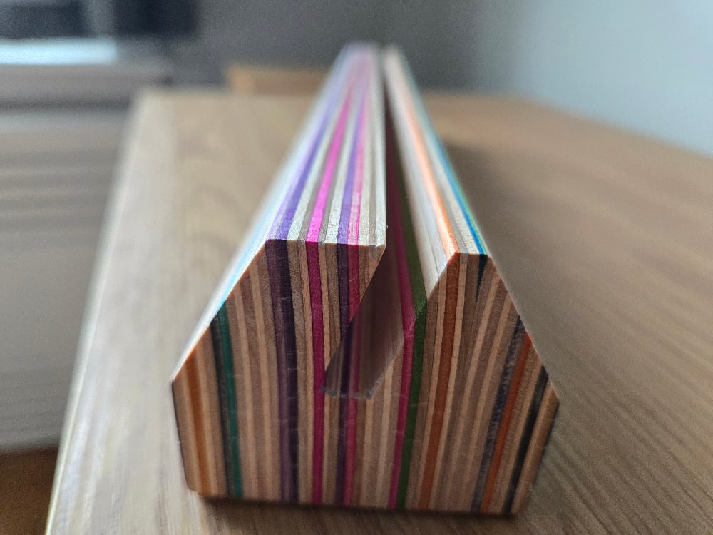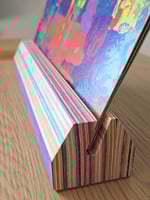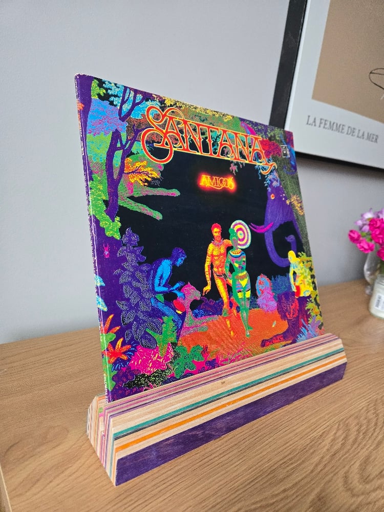 Vinyl record stand out of recycled skateboards.